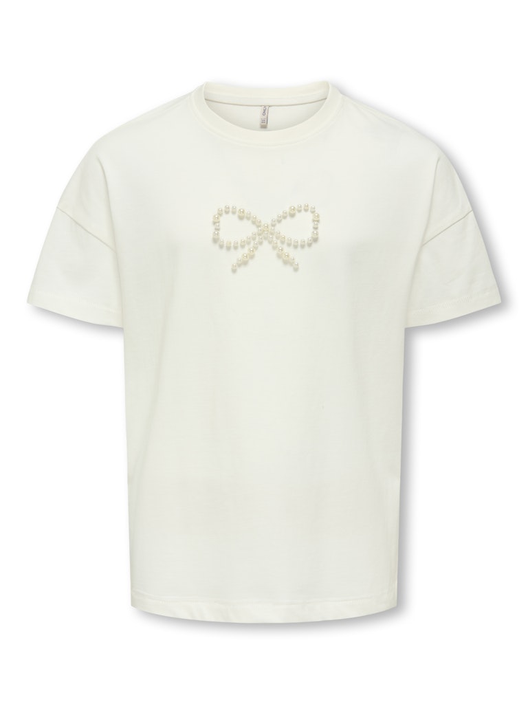 Söt kortärmad topp till barn och ungdomar från Kids Only med rund halsringning och rosett av pärlor mitt på.