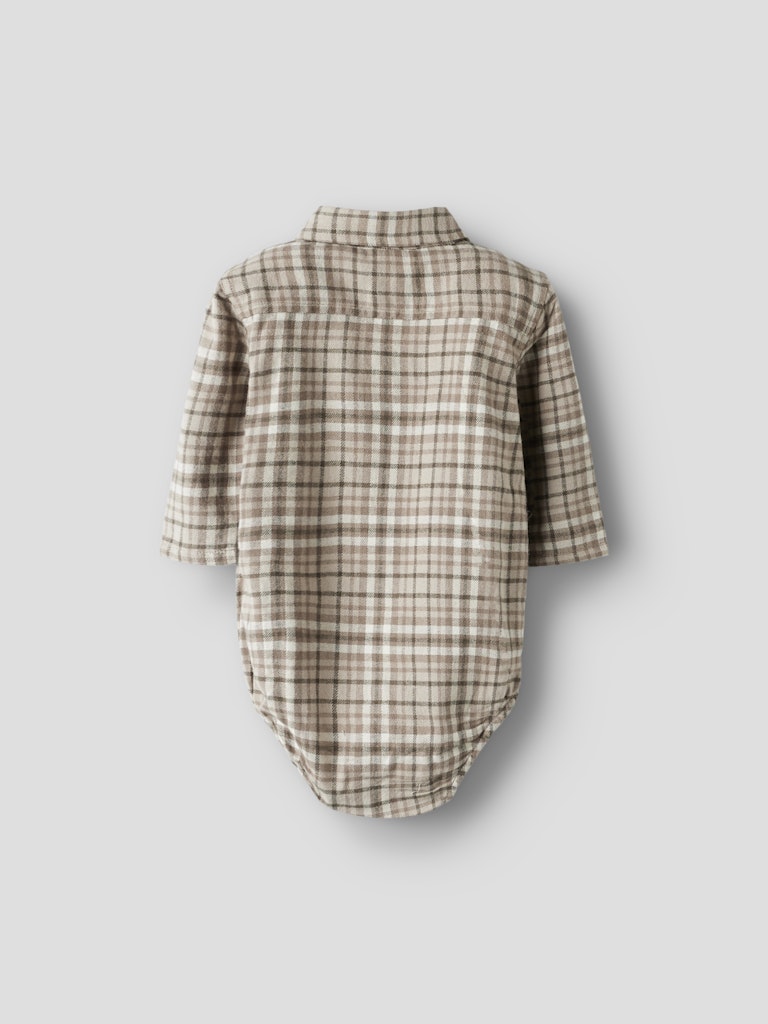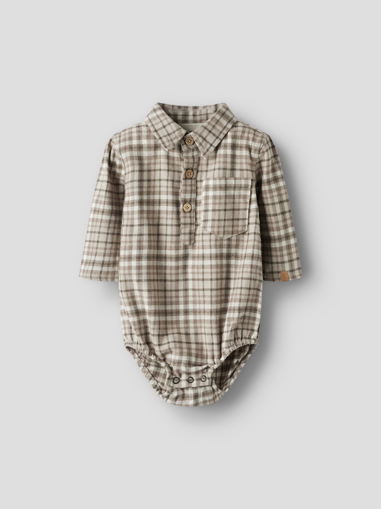 Mjuk rutig skjortbody till baby i ekologisk bomull från Lil'Atelier med klassisk krage, kort knapplist, en bröstficka på vänster bröst samt tryckknappar i grenen.