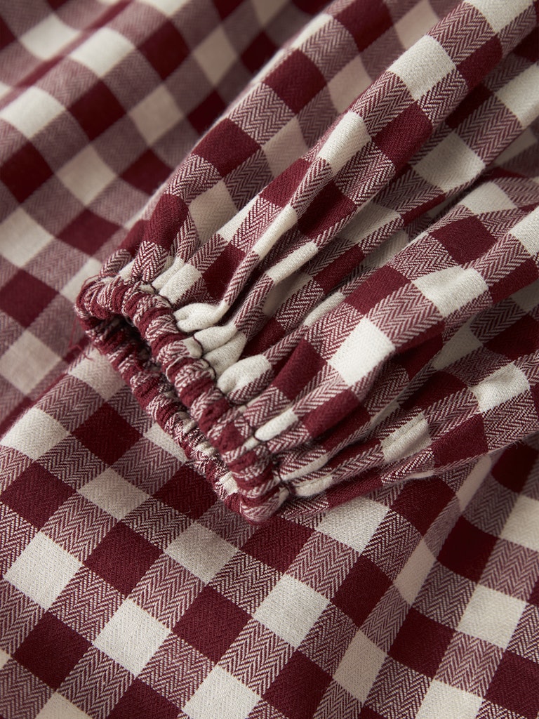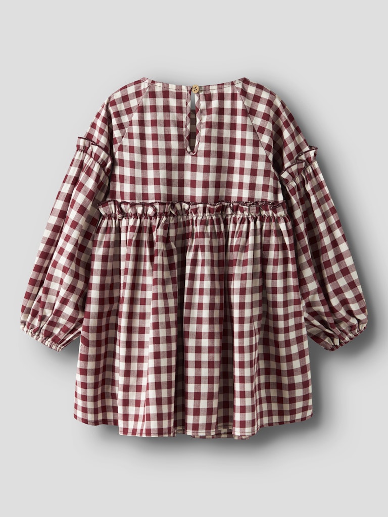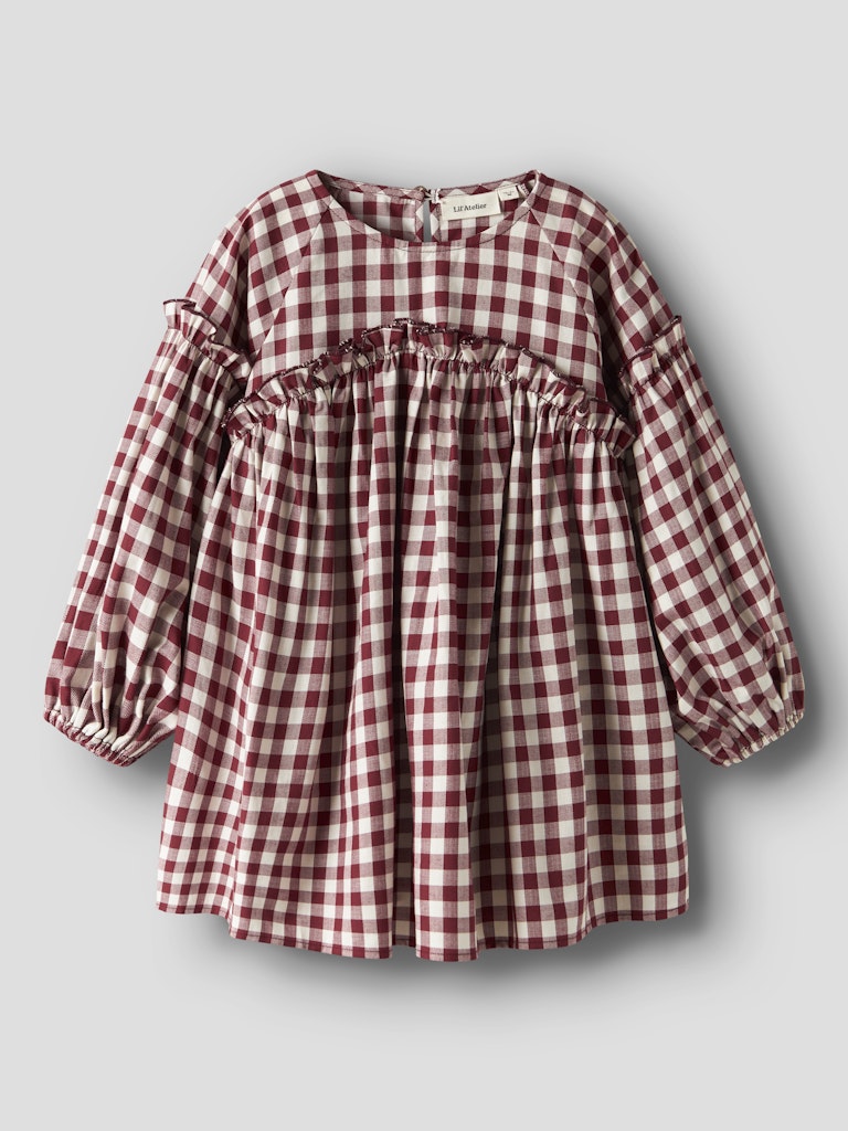 Så söt rutig klänning till barn i ekologisk bomull från Lil'Atelier med rund halsringning, knappknäppning bak och ballongärmar med resår i ärmslutet. En riktig Madickenklänning!