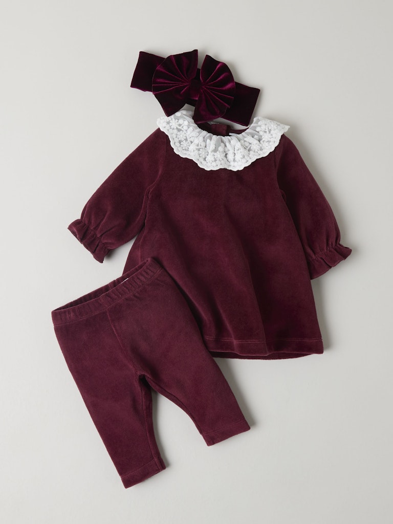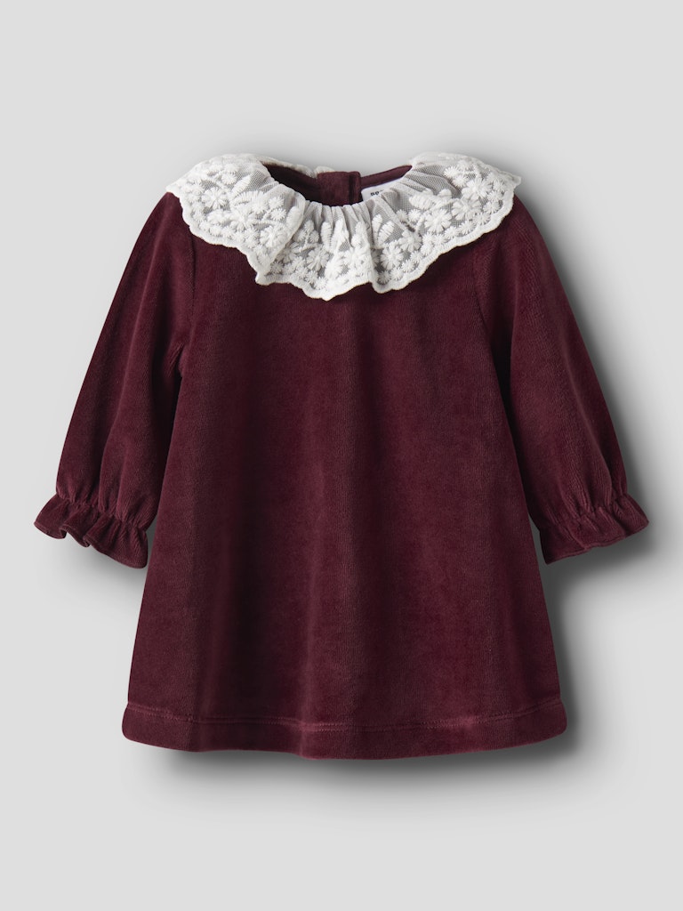 Söt A-formad velourklänning till baby i ekologisk bomull från Name it. Klänningen har en rund halsringning med en fin spetskant, knappknäppning bak och resår i ärmsluten.
