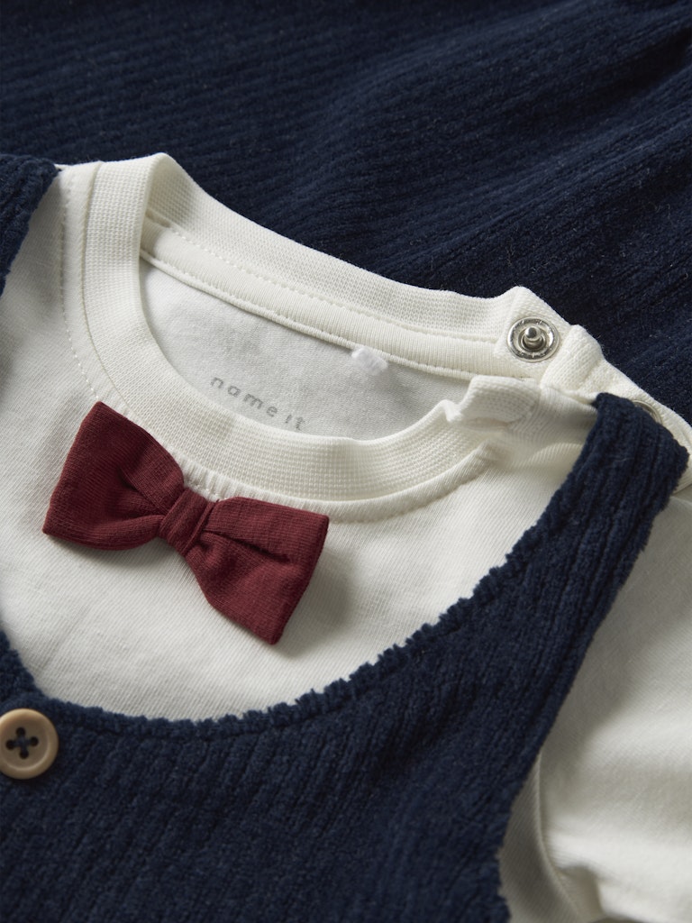 Fint 2-delat bodyset till baby i ekologisk bomull från Name it. Bodyn har en dold knappknäppning på vänster axel, påsydd väst i ribbad velour och en röd fluga i halsringningen. Byxan är även den i en ribbad velour med en nedvikbar mudd i midjan och en mudd i bensluten.