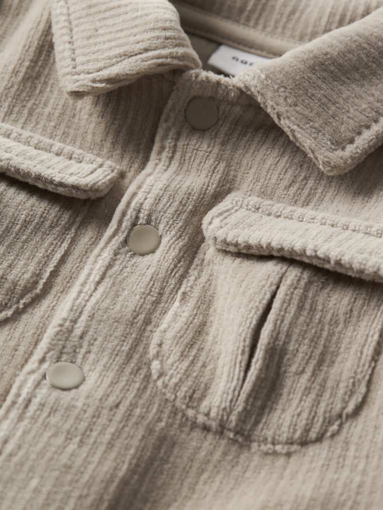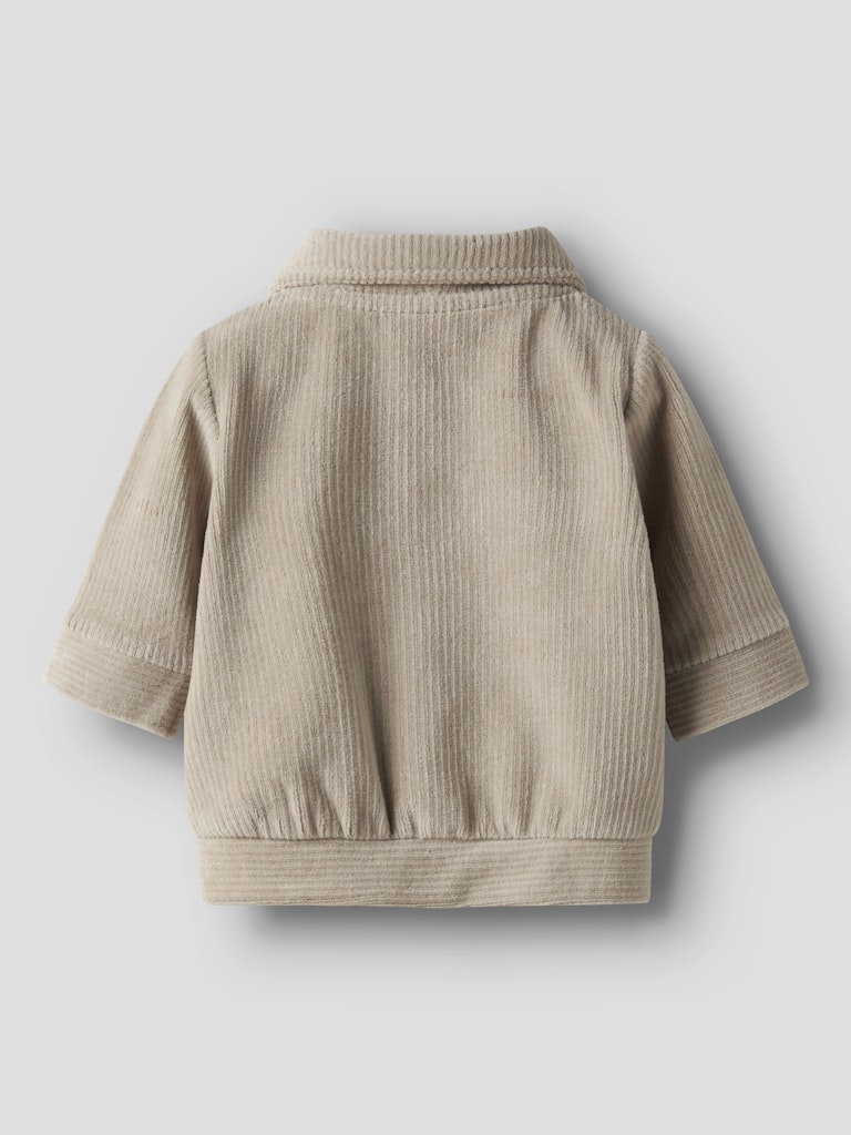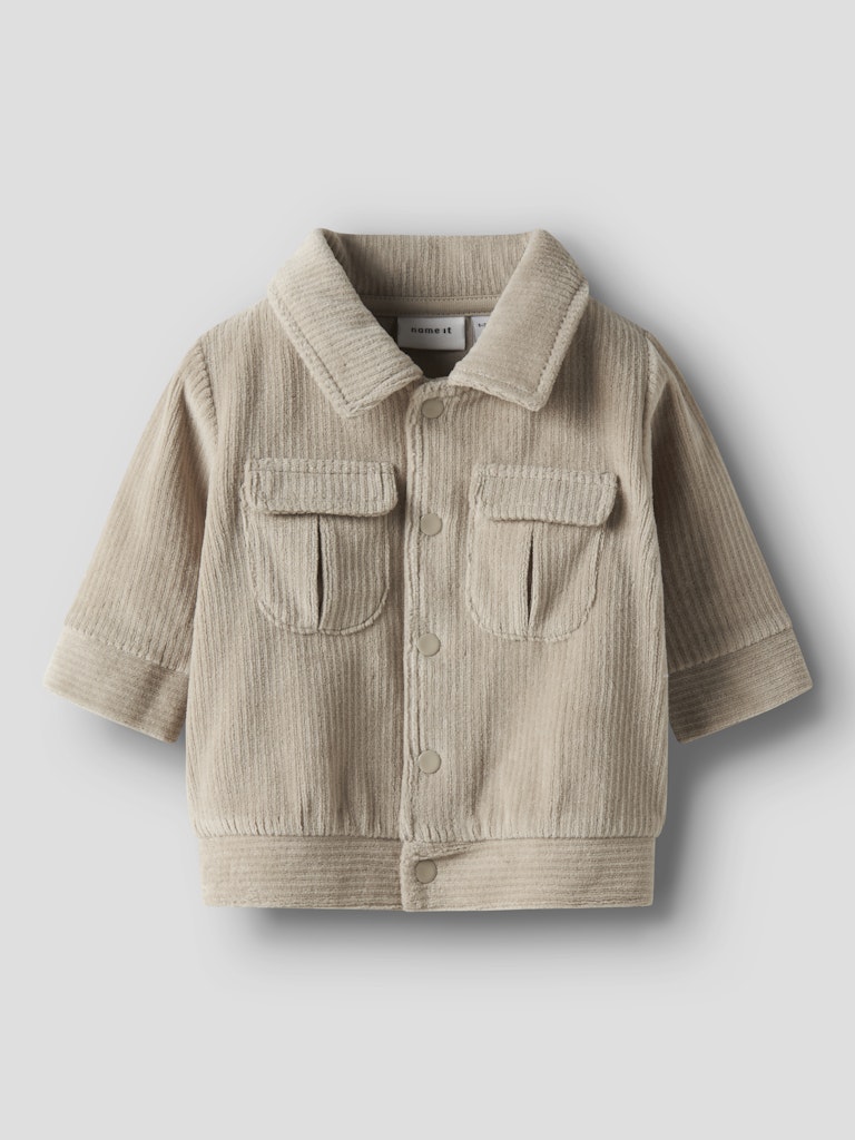 Tuff och mjuk velourkofta till baby från Name it med klassisk krage, genomgående tryckknappsknäppning och två små bröstfickor.