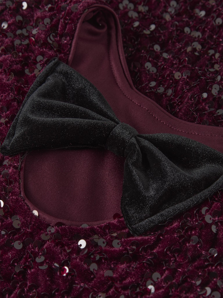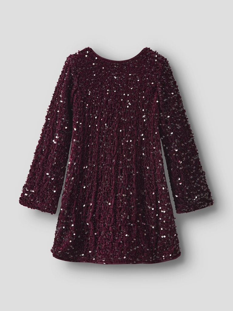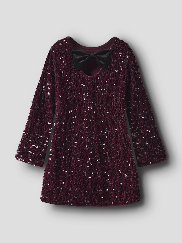 Festlig långärmad paljettklänning till barn från Name it med rund halsringning, en svart sammetsrosett baktill och ett tunt foder inuti för att inga paljetter ska klia.