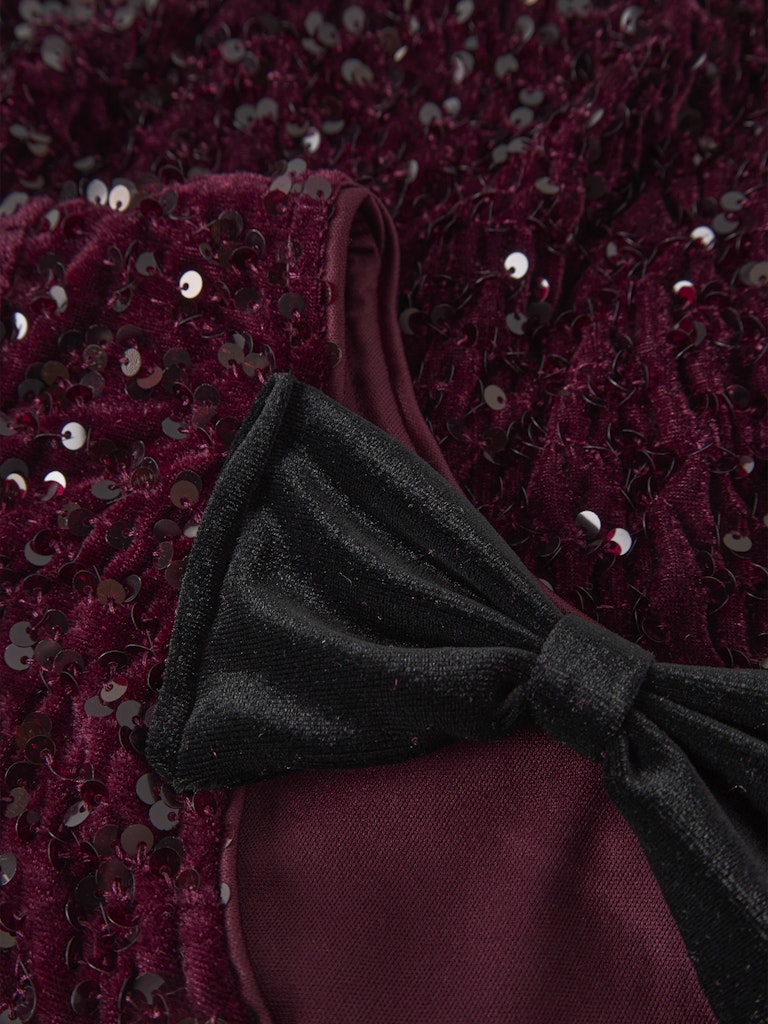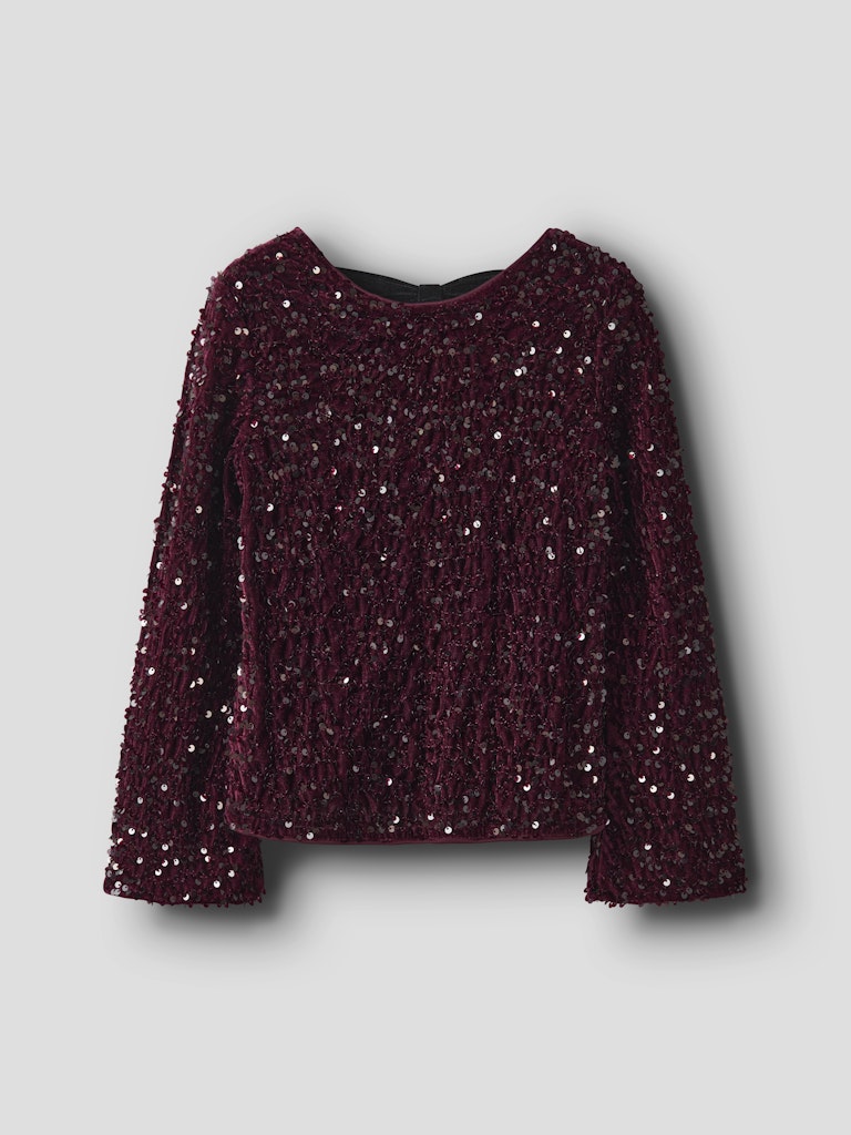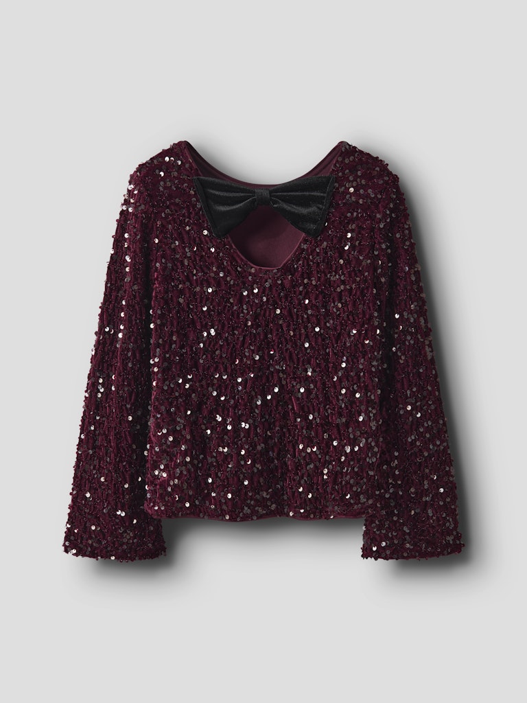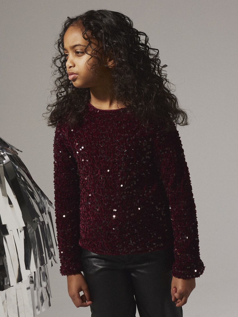 Festlig långärmad paljettopp till barn från Name it med rund halsringning, en svart sammetsrosett baktill och ett tunt foder inuti för att inga paljetter ska klia.