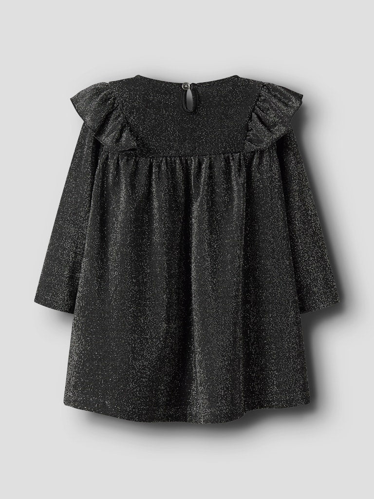 Tuff glittrig långärmad klänning till barn från Name it med rund halsringning, volangdetaljer på axlarna och en stor rosett fram. Glöm inte strumpbyxor!