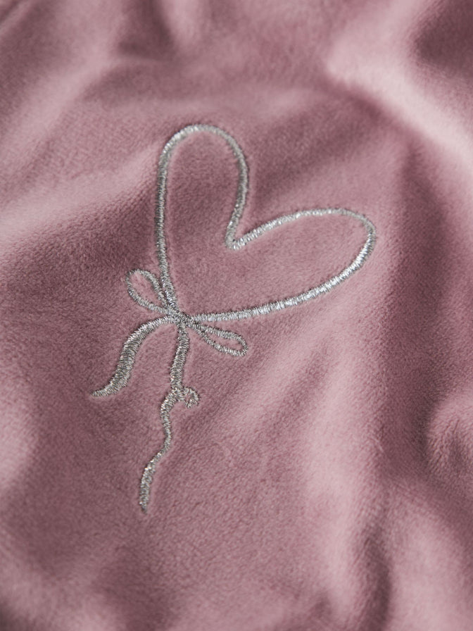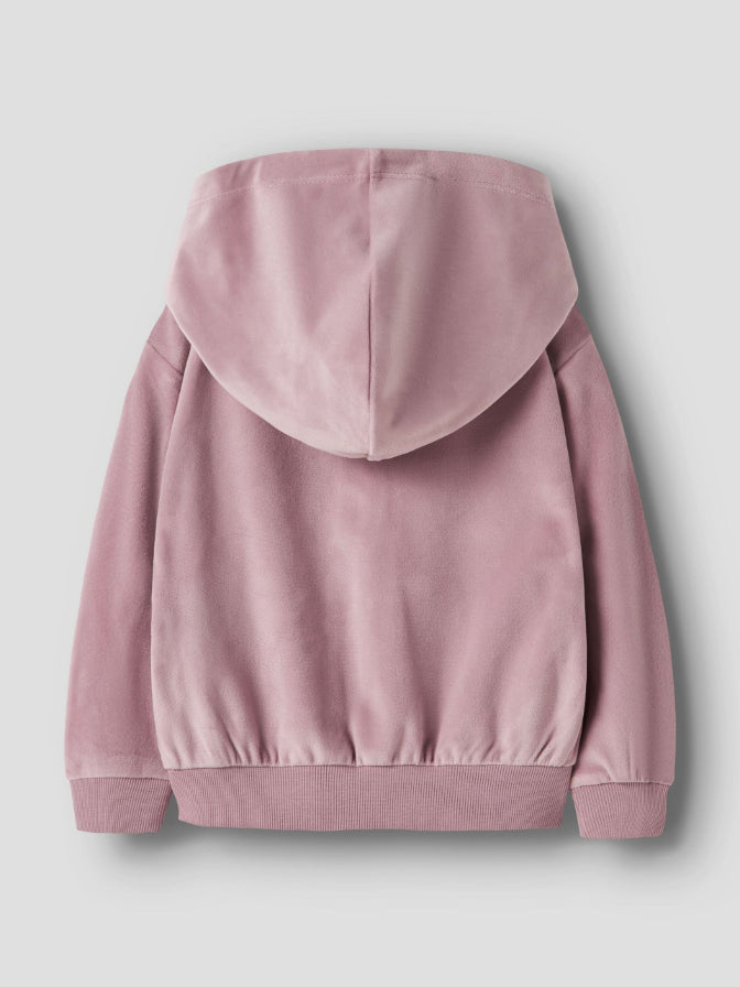 Mjuk och skön hoodie i velour till barn från Name it med fast huva, genomgående blixtlås och fickor i sidorna. Den har även ett broderat hjärta i silver på vänster bröst samt ribbade muddar i ärmslut och midjan.