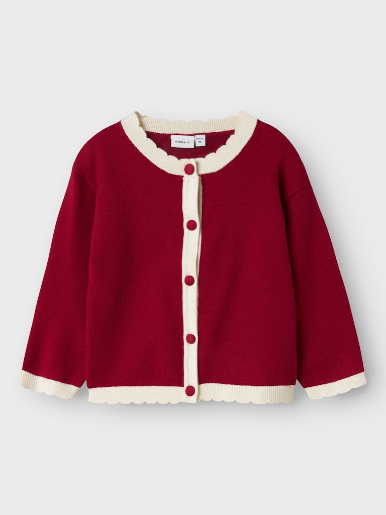 Mjuk och skön kofta till barn från Name it med rund halsringning, genomgående knappknäppning med klädda röda knappar.