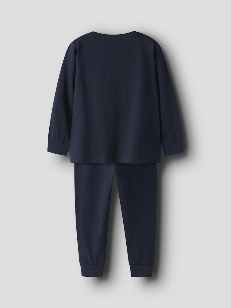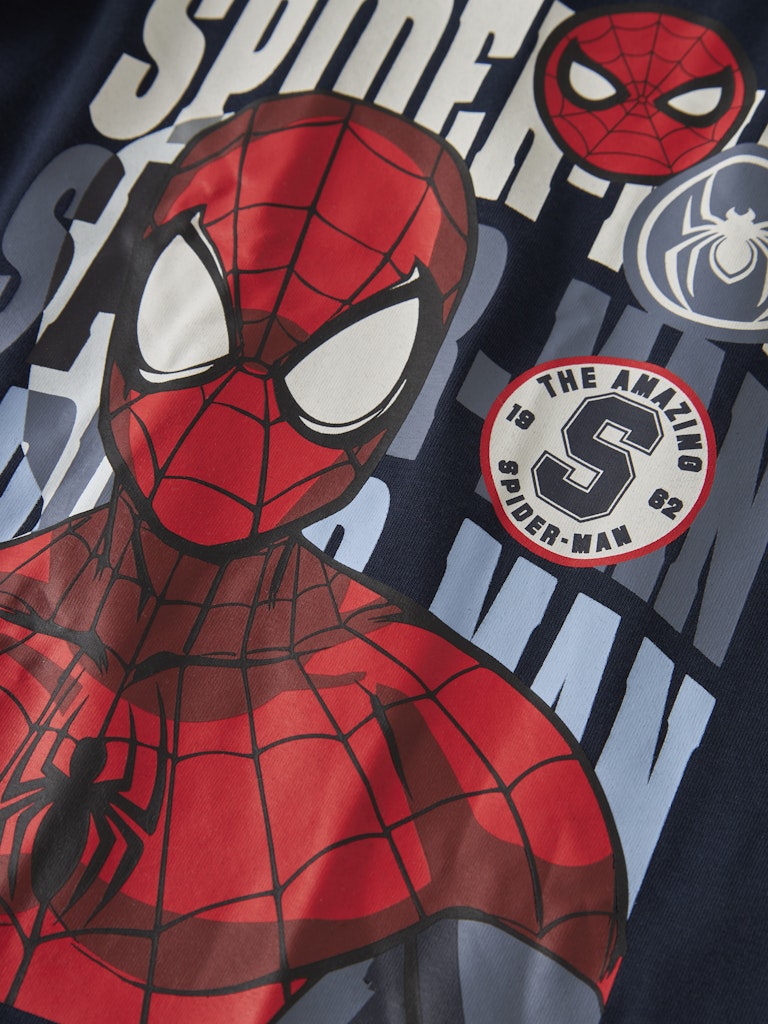 Cool Spidermanpyjamas i två delar till barn från Name it. Toppen har rund halsringning och ett stort Spidermantryck mitt på. Byxan har resår i midjan och muddar i bensluten.